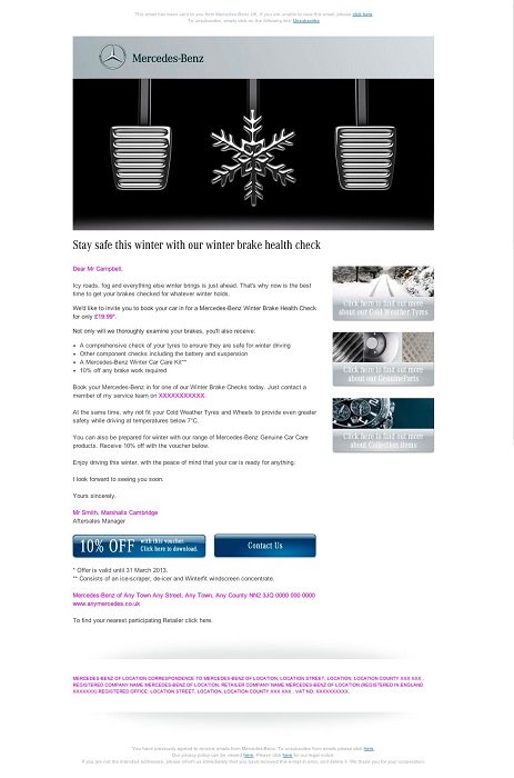 When Mercedes Benz tasked us to create a winter tyre campaign and simplify their servicing options, we soon got a grip. Creating a slick press and email campaign for cold weather tyres. And producing a personalised servicing website which lets customers take control of servicing and costs.